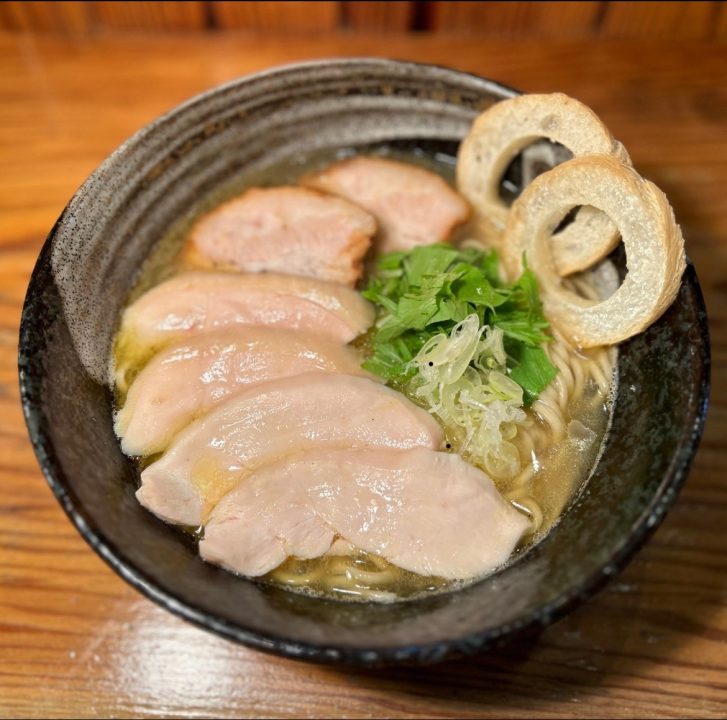 看板メニューの塩ラーメンは、鶏のコクと魚介の旨みが合わさった澄んだスープが特徴で、つるもち食感の麺とも相性抜群です。