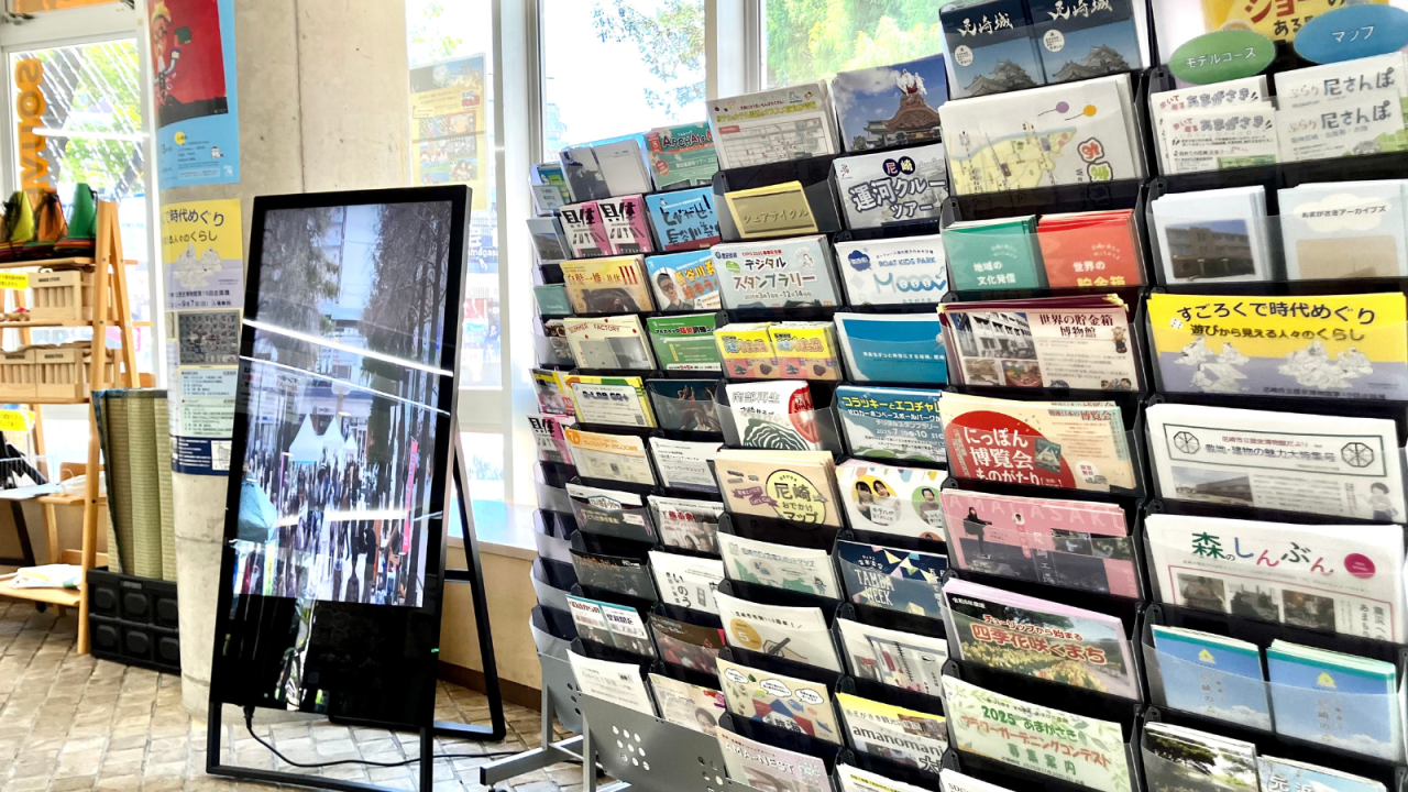 JR尼崎駅の改札口横に位置する案内コーナー。デジタルサイネージによる観光情報の案内などを行っています。
