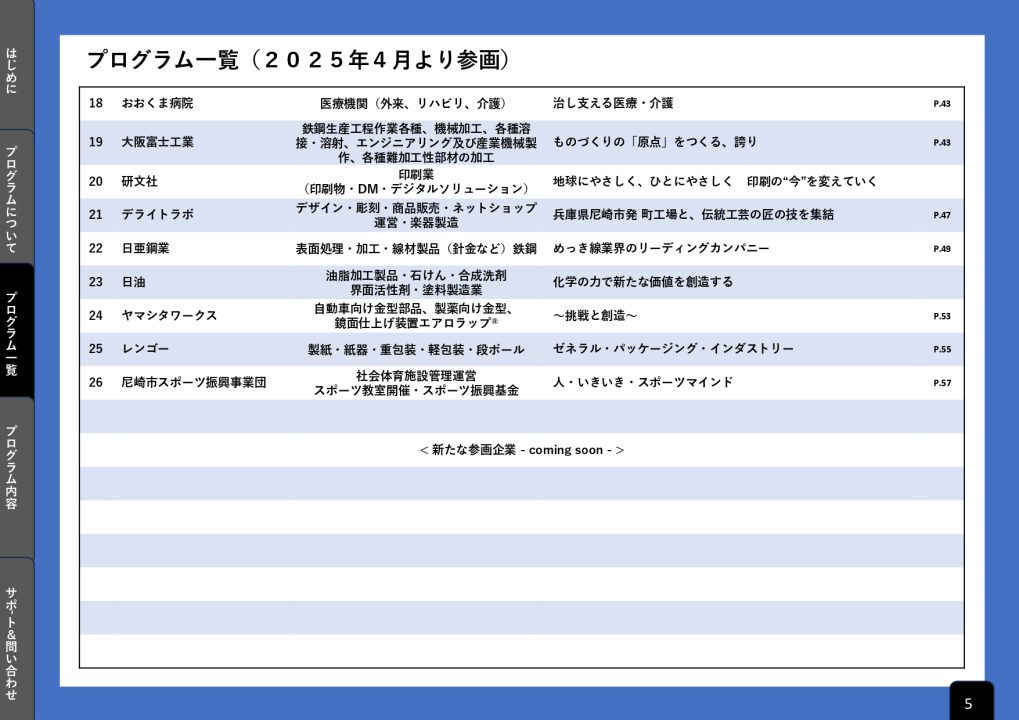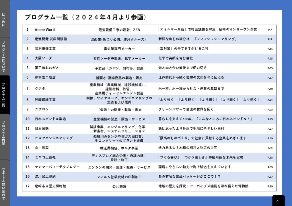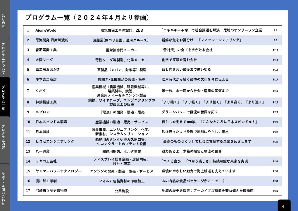 当プログラムは、尼崎市内の個性豊かな製造業を中心とした26団体ご協力のもと、ここ尼崎でしか学べない充実したプログラムとなっています。