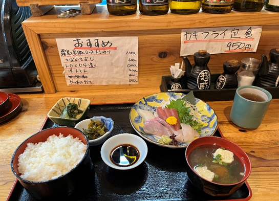 内容は日替わりで、新鮮な生野菜の上に色鮮やかに盛られた刺身は、美しく、そして何よりもおいしい。
